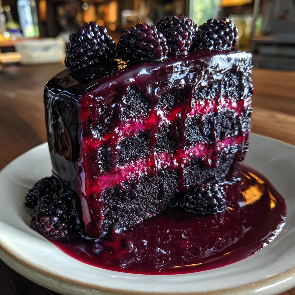 - Once the glaze has set slightly, carefully transfer the cake to its serving plate. Garnish the top with whole fresh blackberries, arranging them similarly to the photo. For an extra touch of gothic glamour, you can add edible gold leaf or spun sugar webs.