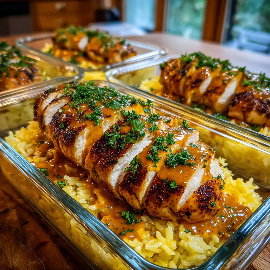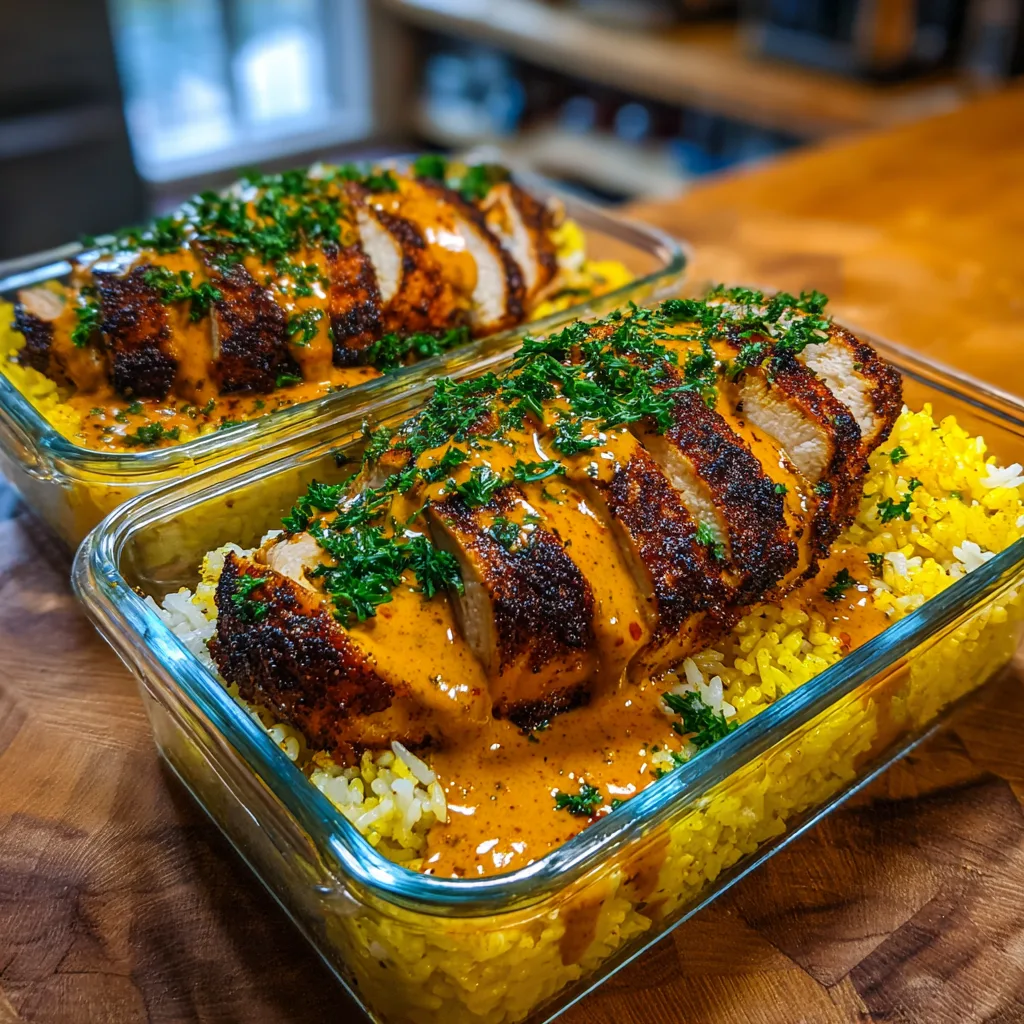 Slice your rested chicken into strips. Scoop a generous portion of yellow rice into your meal prep containers or plates. Lay the sliced chicken on top. Now, for the finale: drizzle that glossy, creamy sauce all over the chicken and rice. Garnish with chopped fresh parsley for a pop of green.