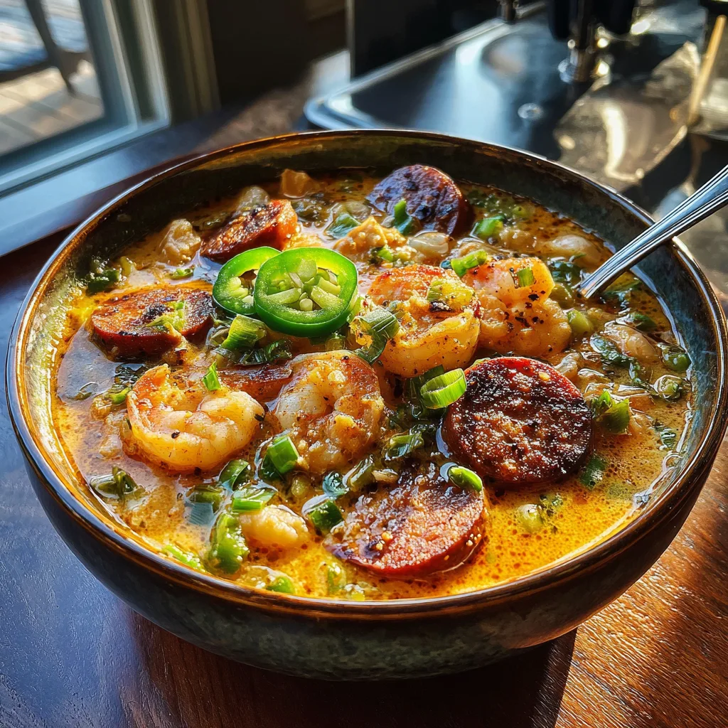 Creamy Cajun White Chicken Chili with Shrimp and Andouille