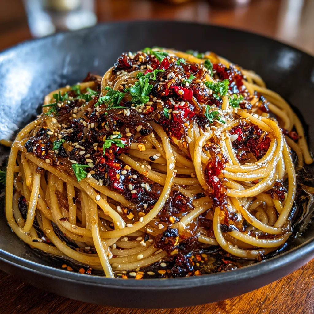 A deeply savory, sweet, and spicy pasta dish featuring slowly caramelized onions, garlic, and fiery chili crisp oil tossed with long noodles.