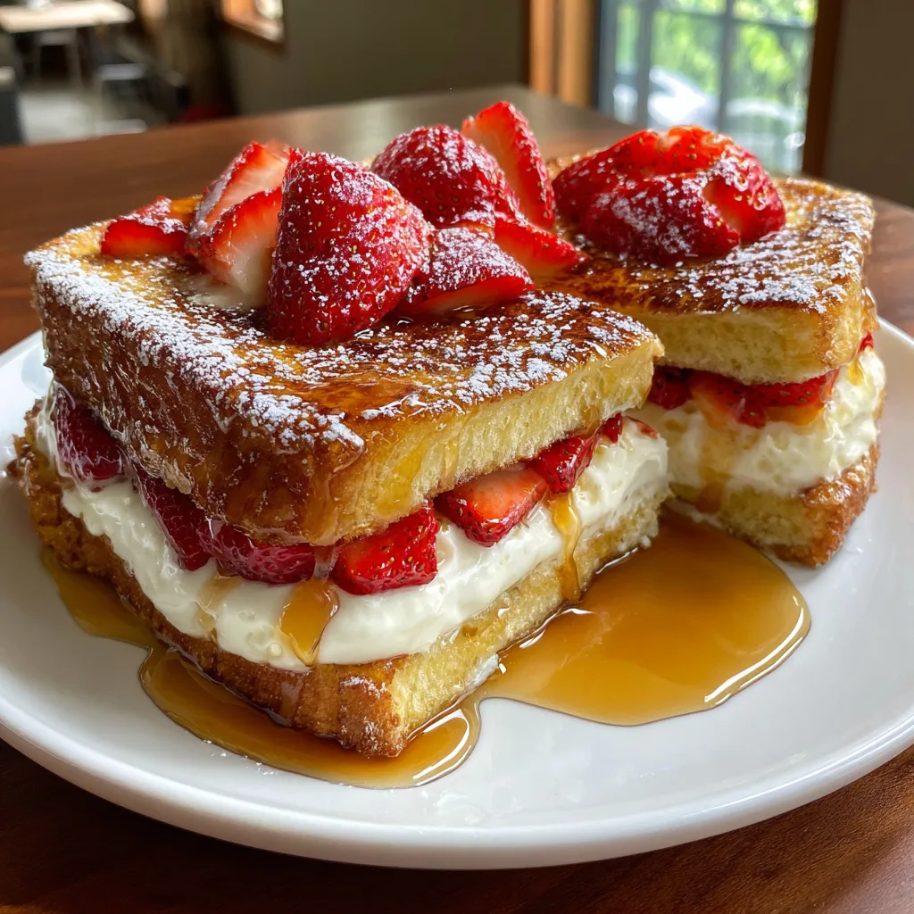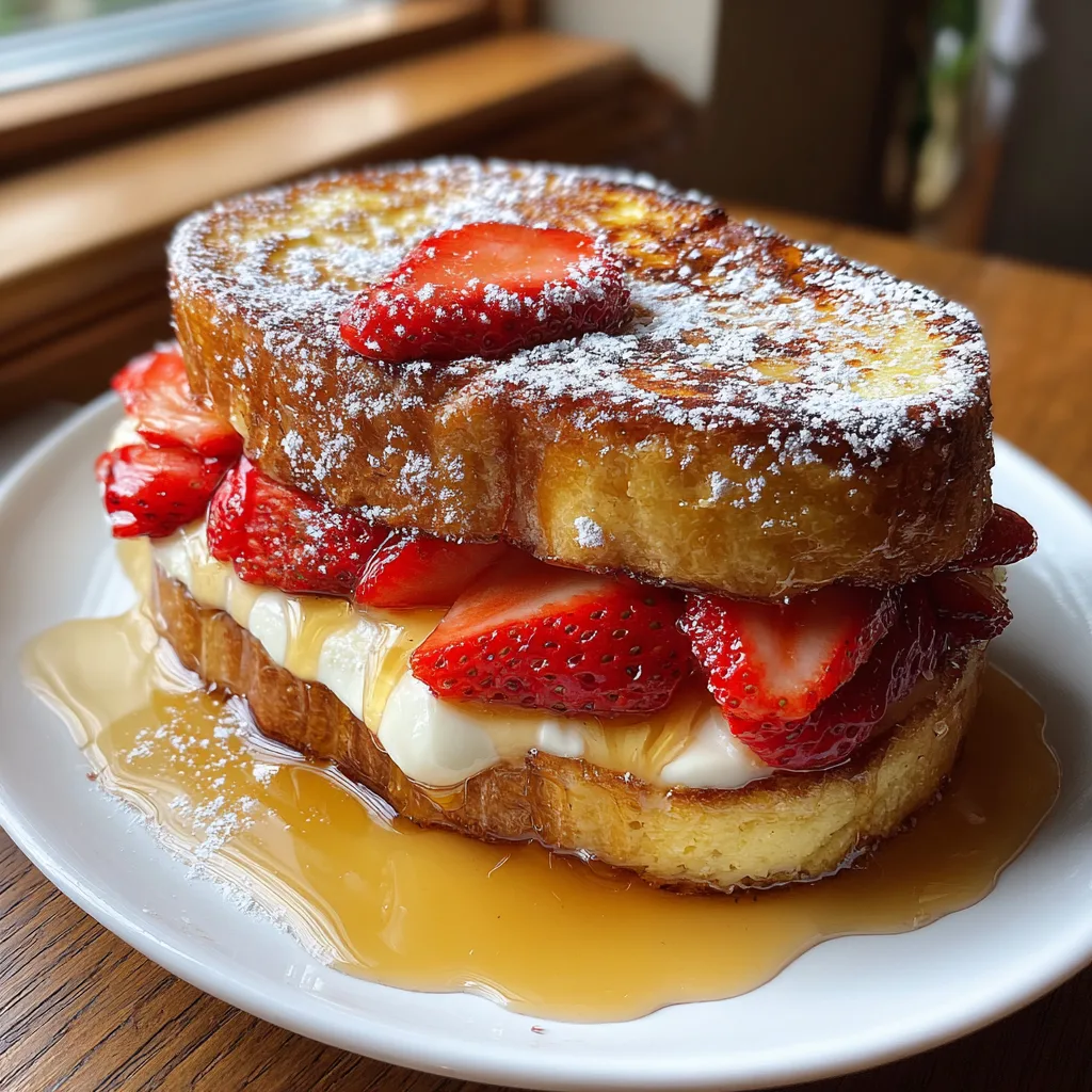 - Serve and Garnish: Remove the cooked French toast from the skillet and place it on a serving plate. Top generously with sliced fresh strawberries. Use a fine-mesh sieve to dust the top with powdered sugar, and pour warm, glossy maple syrup over the entire stack just before serving.