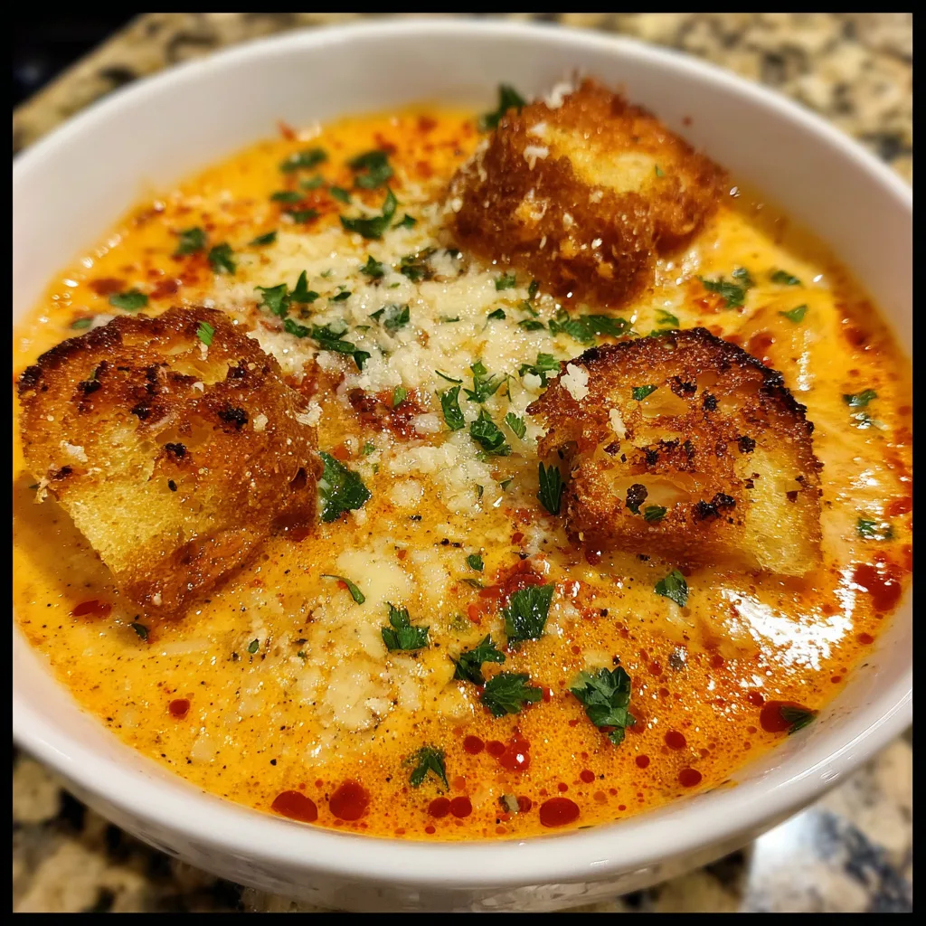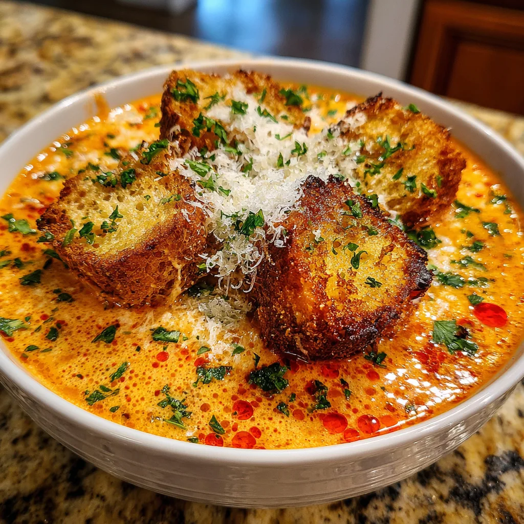 As the colder months roll in, or frankly, whenever the craving for something hearty hits, this soup is the answer. It requires minimal effort thanks to the slow cooker, yet it tastes like you spent all day hovering over the stove. The broth is a luxurious blend of crushed tomatoes and cream, creating a velvety orange hue that coats every shred of tender chicken. But the real showstopper? The toppings. By finishing the bowl with giant, crunchy garlic croutons and a blizzard of fresh cheese, you recreate the “breading” crunch of the traditional dish, adding a textural contrast that makes this soup absolutely addictive.