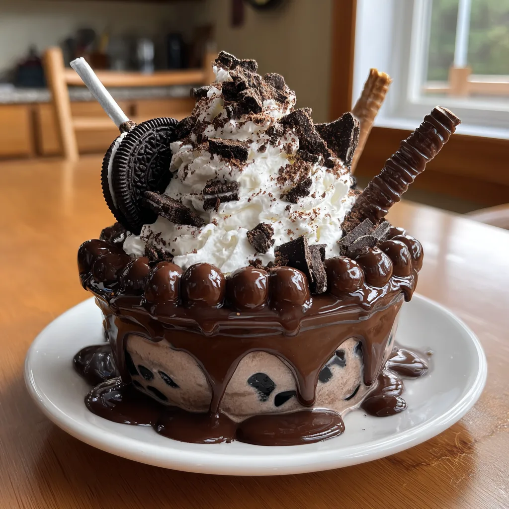 The Garnish: A heavy dusting of cocoa powder, a sprinkle of mini chocolate chips, and a generous drizzle of glossy chocolate syrup tie the whole chaotic masterpiece together.