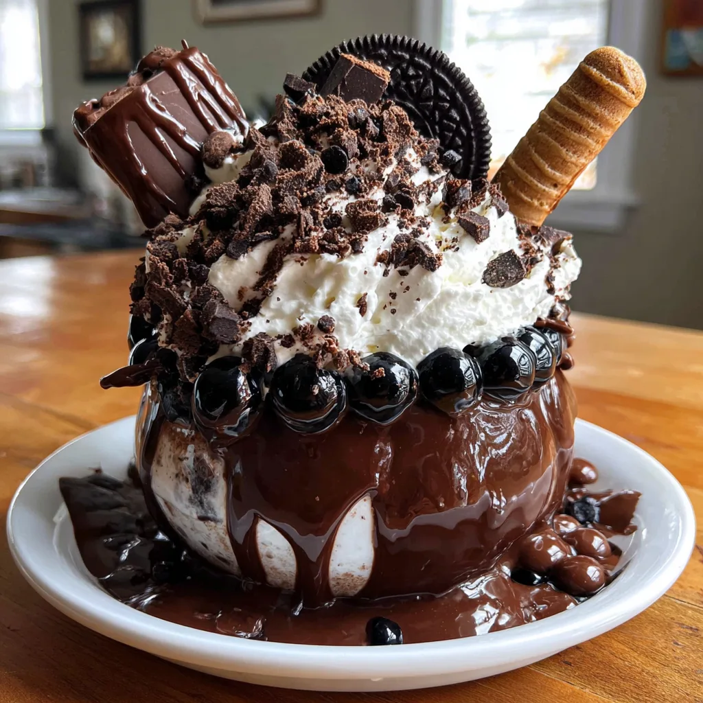 The Ice Cream Bar: The absolute crown jewel of this dessert is a full, chocolate-covered ice cream bar on a stick (like a Magnum bar) plunged right into the center. It adds height, drama, and a whole secondary dessert to the mix.