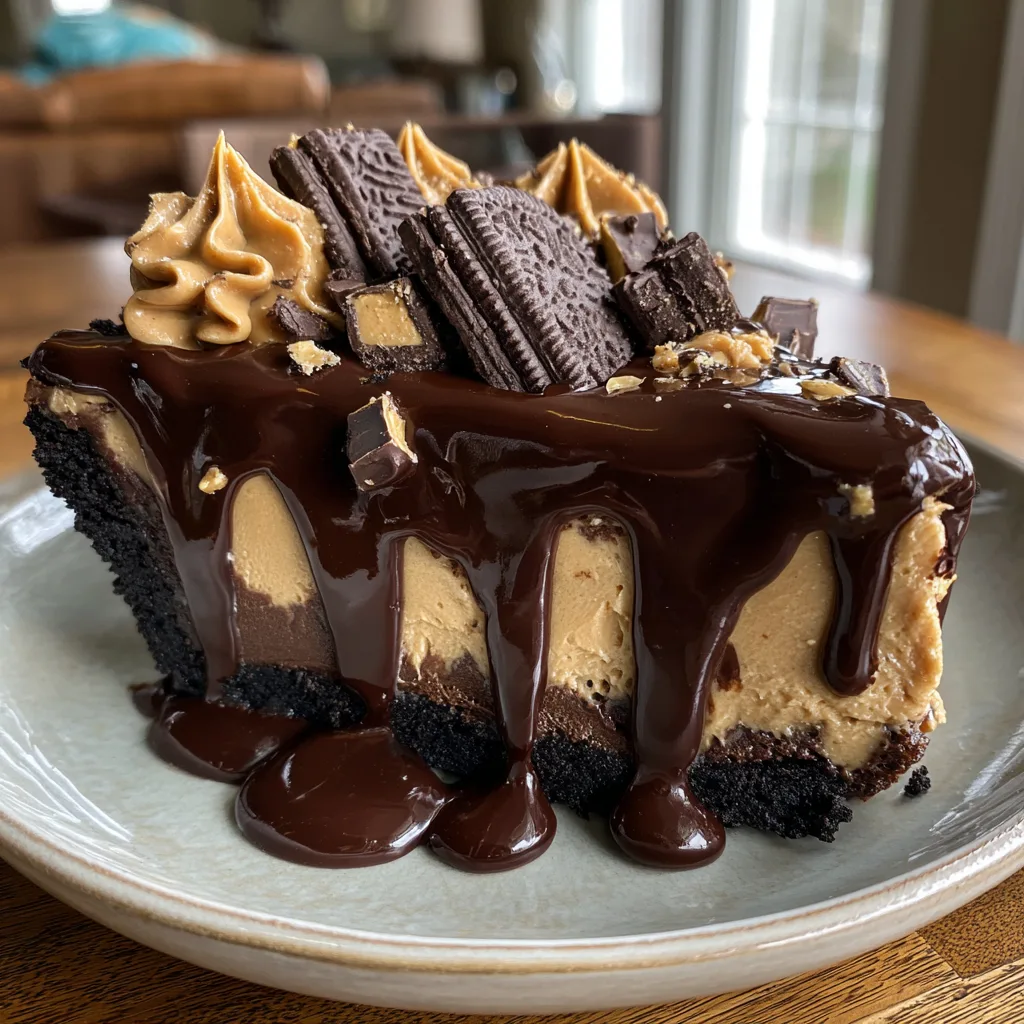 A decadent, no-bake layered pie featuring an Oreo crust, a hidden fudge layer, a massive creamy peanut butter filling, topped with smooth chocolate ganache and peanut butter cups.