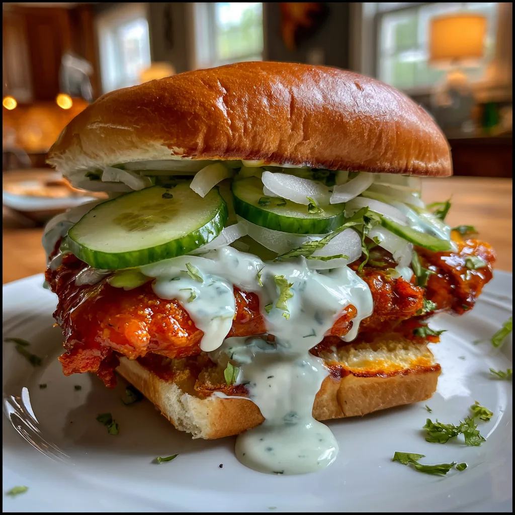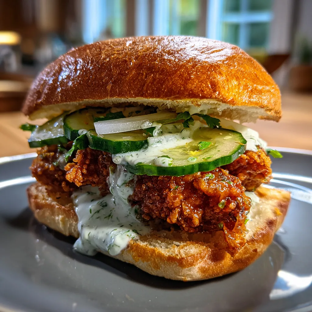 This sandwich is the ultimate answer to “what’s for lunch?” when you want something better than takeout. It mimics the style of those high-end gastropub sandwiches but is completely achievable in your own kitchen. The key here is the interplay of textures: the soft, toasted bun, the jagged crunch of the chicken, the crisp snap of fresh cucumber, and the velvety smoothness of the sauce. It is messy, it is indulgent, and it is guaranteed to become a new favorite in your recipe rotation.