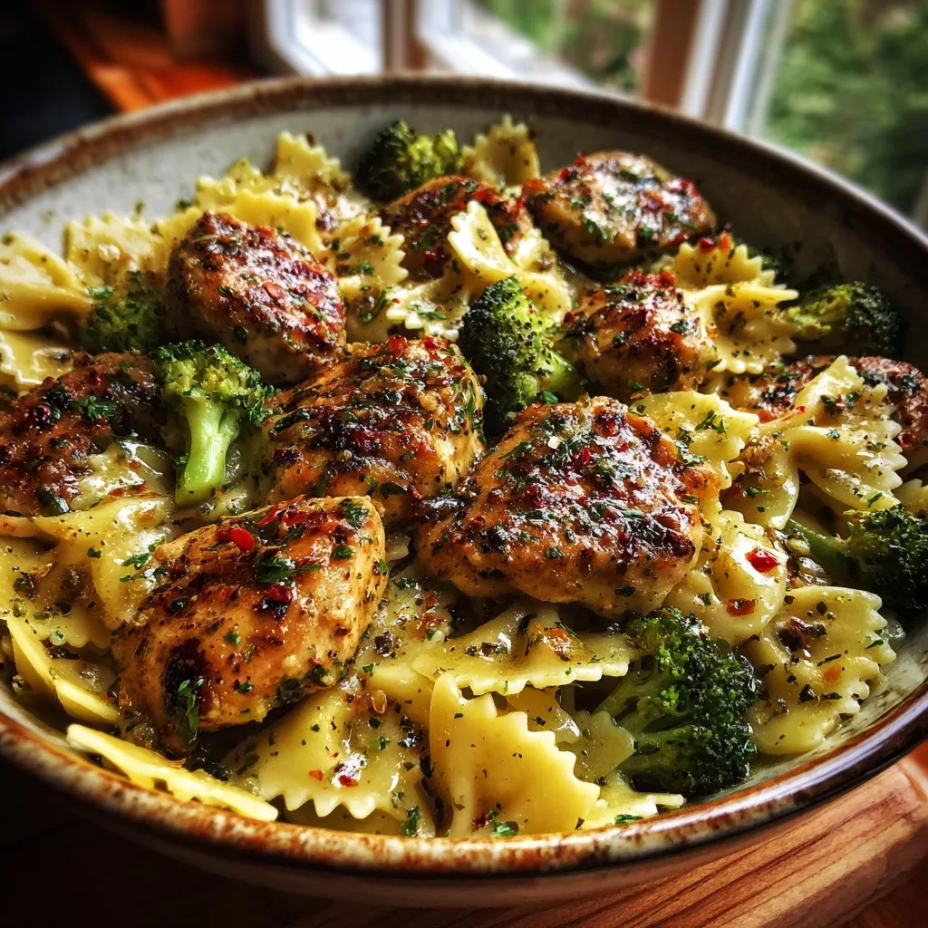 A hearty, rustic pasta dish featuring spicy seasoned chicken, tender broccoli, and farfalle tossed in a glossy, rich lemon butter garlic sauce.