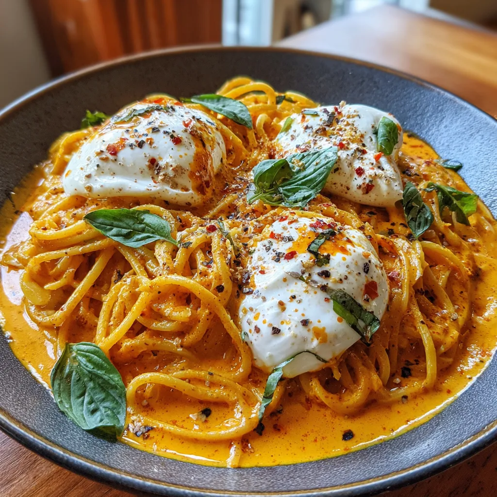 This dish is the perfect intersection of rustic Italian simplicity and modern comfort food. The sauce is a brilliant orange-red hue, created by blending roasted red peppers with aromatics and cream, which clings lovingly to every strand of pasta. When topped with cool, milky burrata cheese that melts slightly into the hot pasta, it creates a contrast in temperature and texture that is simply irresistible.