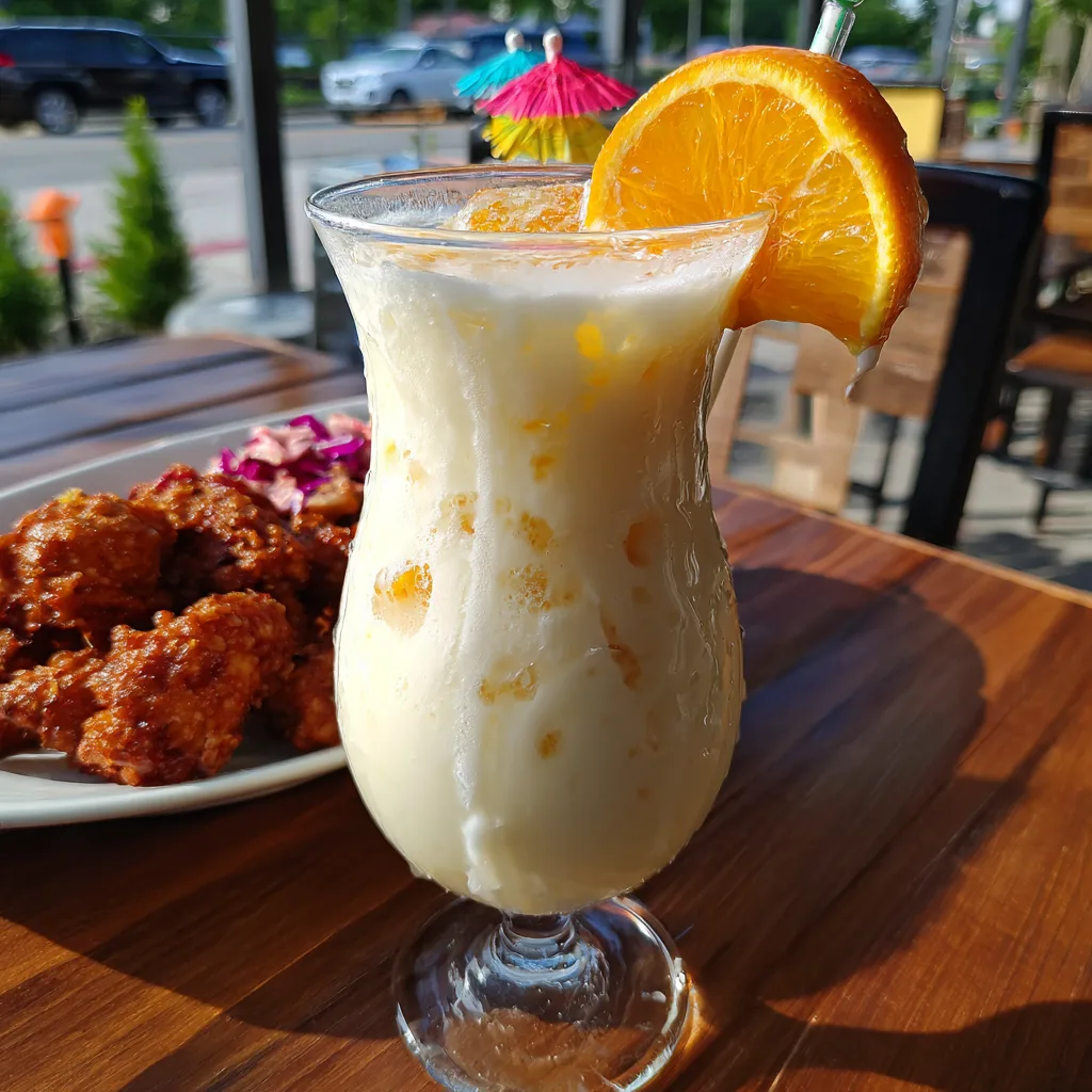 Crispy Fried Chicken: As seen in classic outdoor dining setups, pairing this creamy drink with a plate of crispy, hot fried chicken bites is a revelation. The acidity of the pineapple cuts through the rich grease of the fried chicken, while the icy temperature cools the palate.