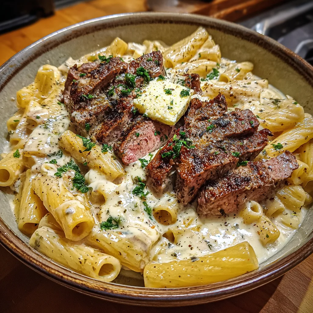 Divide the creamy pasta into bowls. Top generously with the sliced steak. For the “chef’s kiss” finish, place a small pat of butter on the hot steak to melt, and garnish with fresh chopped parsley. Serve immediately.