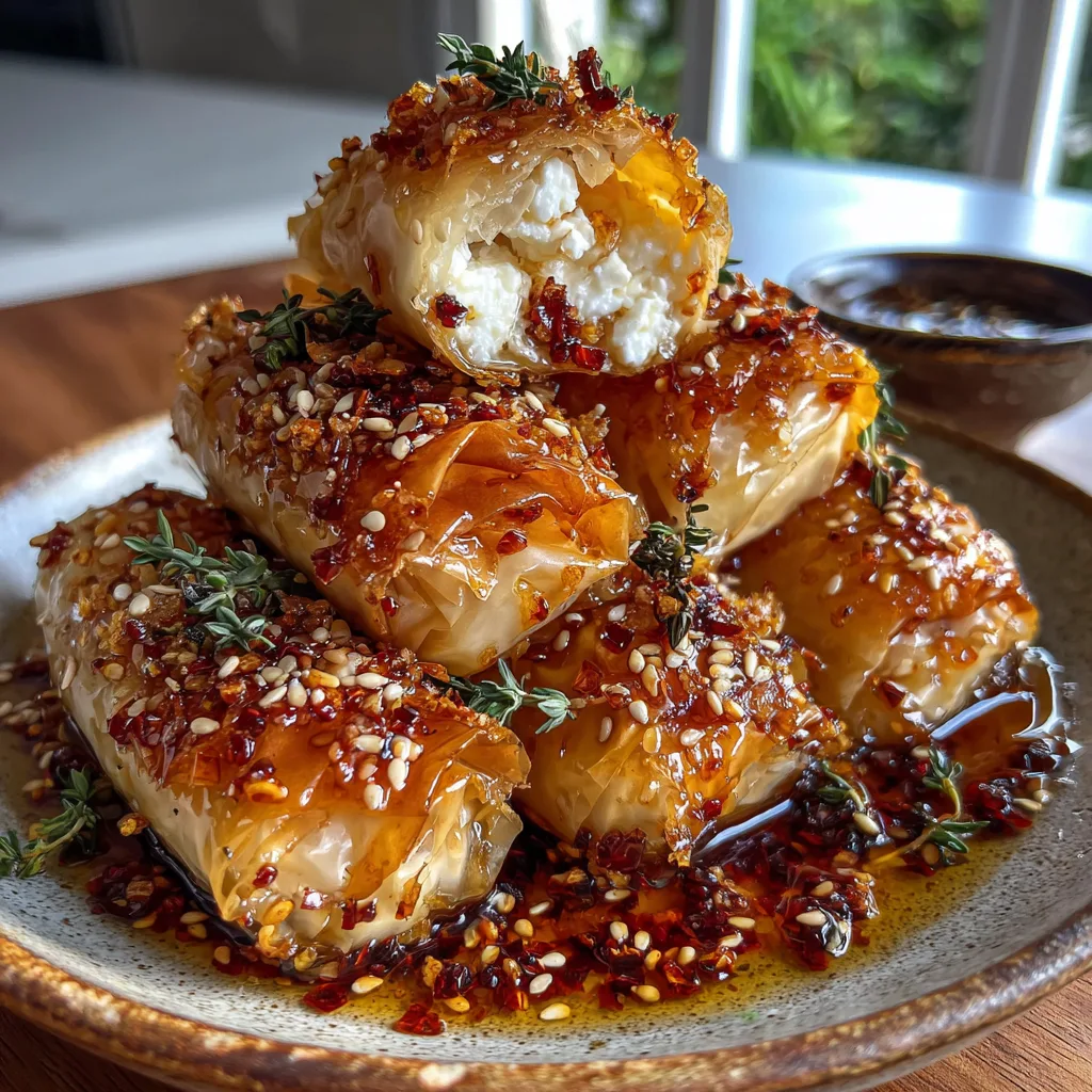 The concept is simple but effective: blocks of salty, tangy feta cheese are encased in layers of buttery phyllo dough, baked until they are audibly crunchy, and then immediately drenched in a sticky, spicy honey glaze infused with chili flakes and fresh herbs. The heat from the oven transforms the feta into a soft, warm delight that contrasts beautifully with the brittle crunch of the pastry. Whether you are hosting a dinner party, looking for a game-day snack, or just craving a savory indulgence, these rolls are a guaranteed crowd-pleaser.