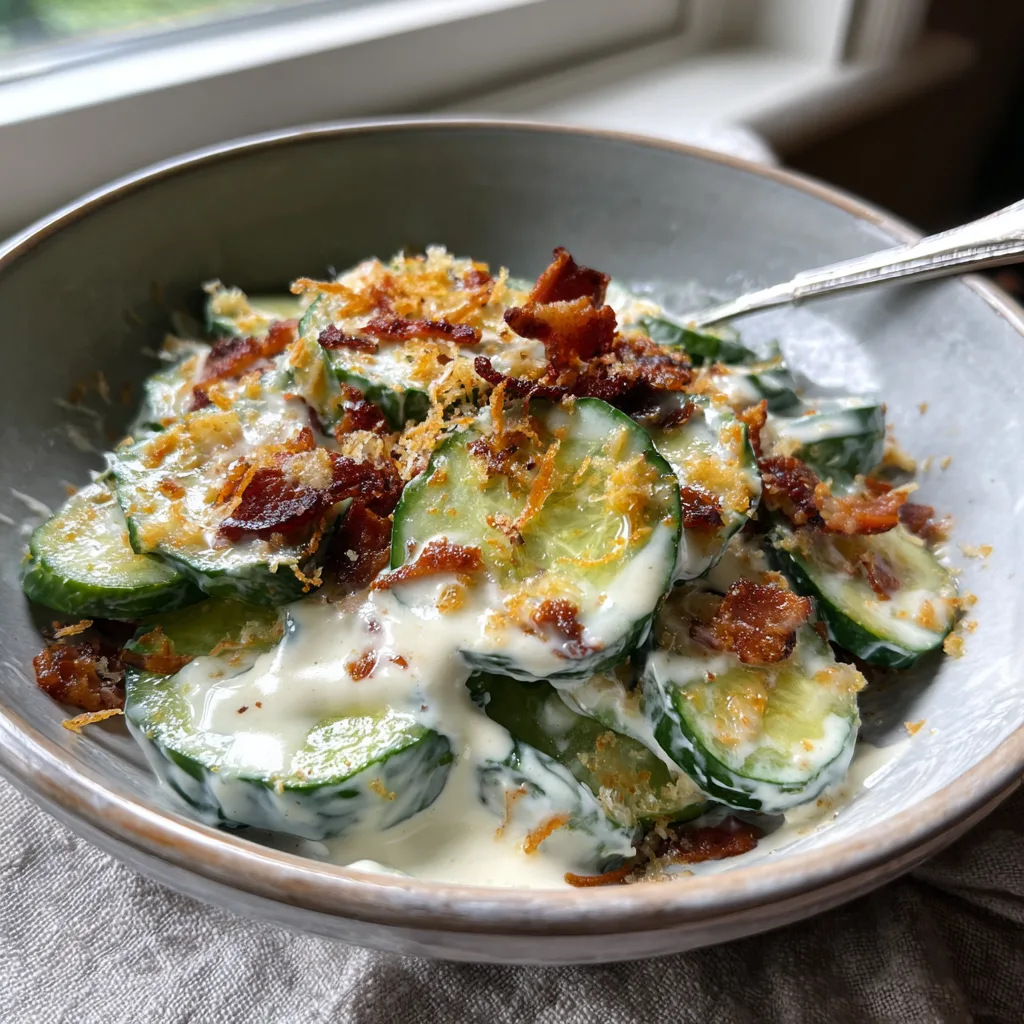 For our Keto and Low-Carb friends: The base of cucumbers, bacon, cheese, and high-fat dressing is already perfectly aligned with a ketogenic diet. The only high-carb culprit is the Panko breadcrumbs. To maintain that essential crunch without the carbs, swap the toasted breadcrumbs for crushed pork rinds, toasted almond slices, or crushed keto-friendly cheese crisps.