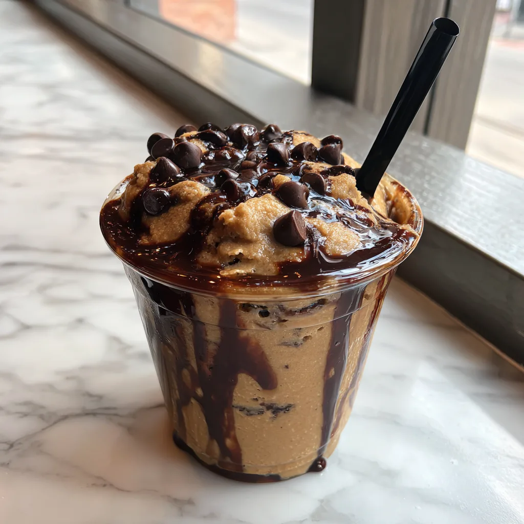 - Assemble and Serve: Remove your chocolate-drizzled glass from the freezer. Carefully pour or spoon the incredibly thick cookie dough frappe into the glass, piling it high above the rim.