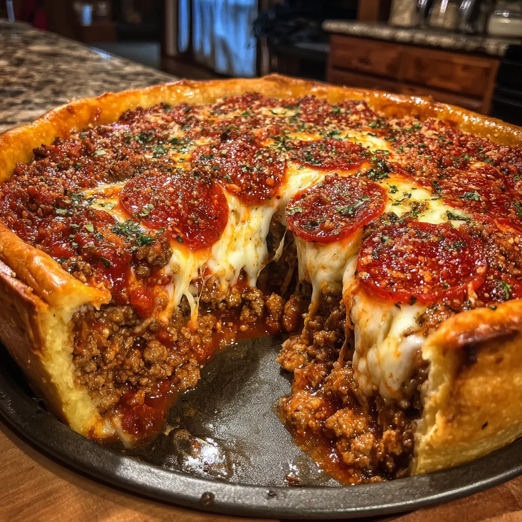 A towering Chicago-style deep dish pizza baked in a cast iron skillet, featuring a buttery crust, thick layers of mozzarella, savory ground meats, pepperoni, and a rich tomato sauce.