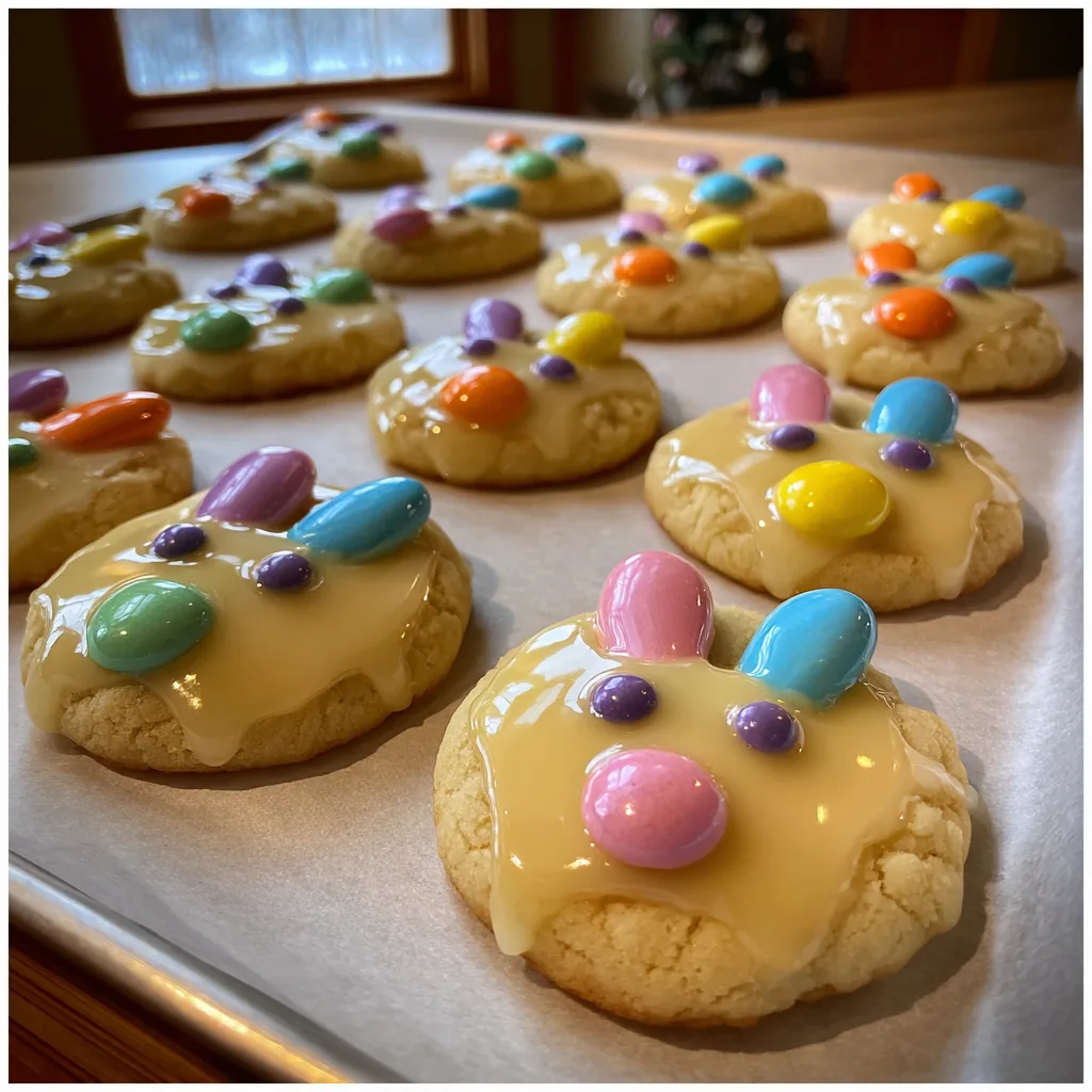 - Immediately upon removing from the oven, press three pastel M&Ms into each hot cookie to create a bunny face (one flat for the face, two angled up for the ears).