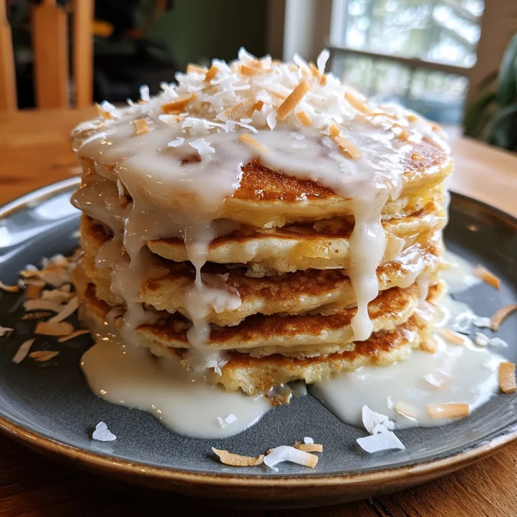 - Serve: Stack the pancakes high. Pour the glaze generously over the top, letting it drip down the sides. Top with extra shredded coconut.