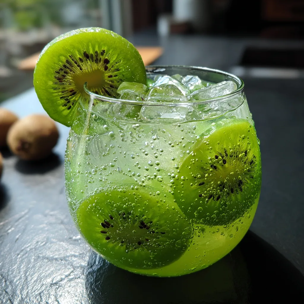 When pouring for guests, use large, round, stemless wine glasses or classic mason jars. Fill them generously to the top with ice. Take a thin slice of fresh kiwi and cut a small slit halfway through the middle, then slide it onto the rim of the glass. You can also throw a few fresh blueberries or raspberries into the glasses before pouring; the contrasting colors look stunning against the pale green liquid.