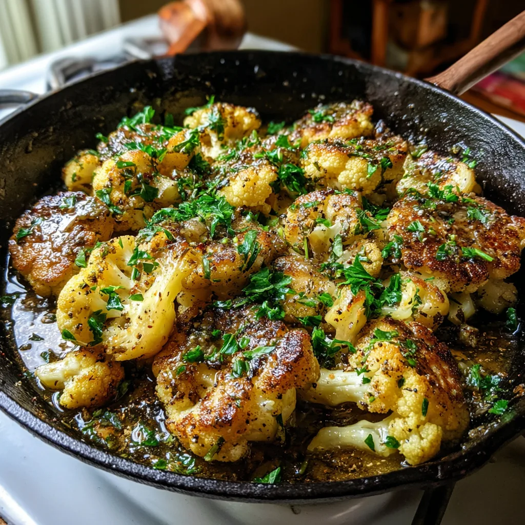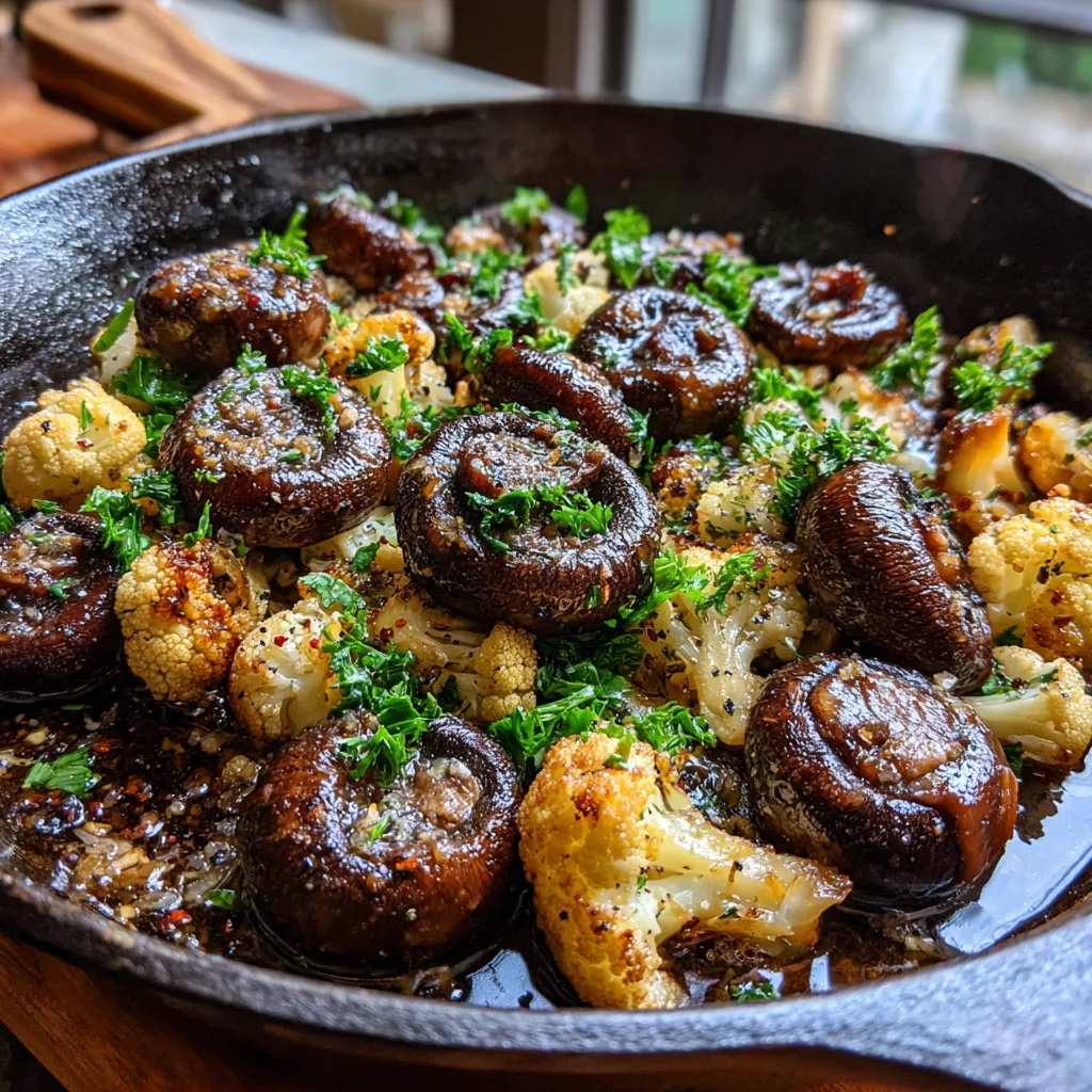 A savory, low-carb side dish featuring perfectly seared mushrooms and tender-crisp cauliflower tossed in a rich, glossy garlic and herb butter sauce.