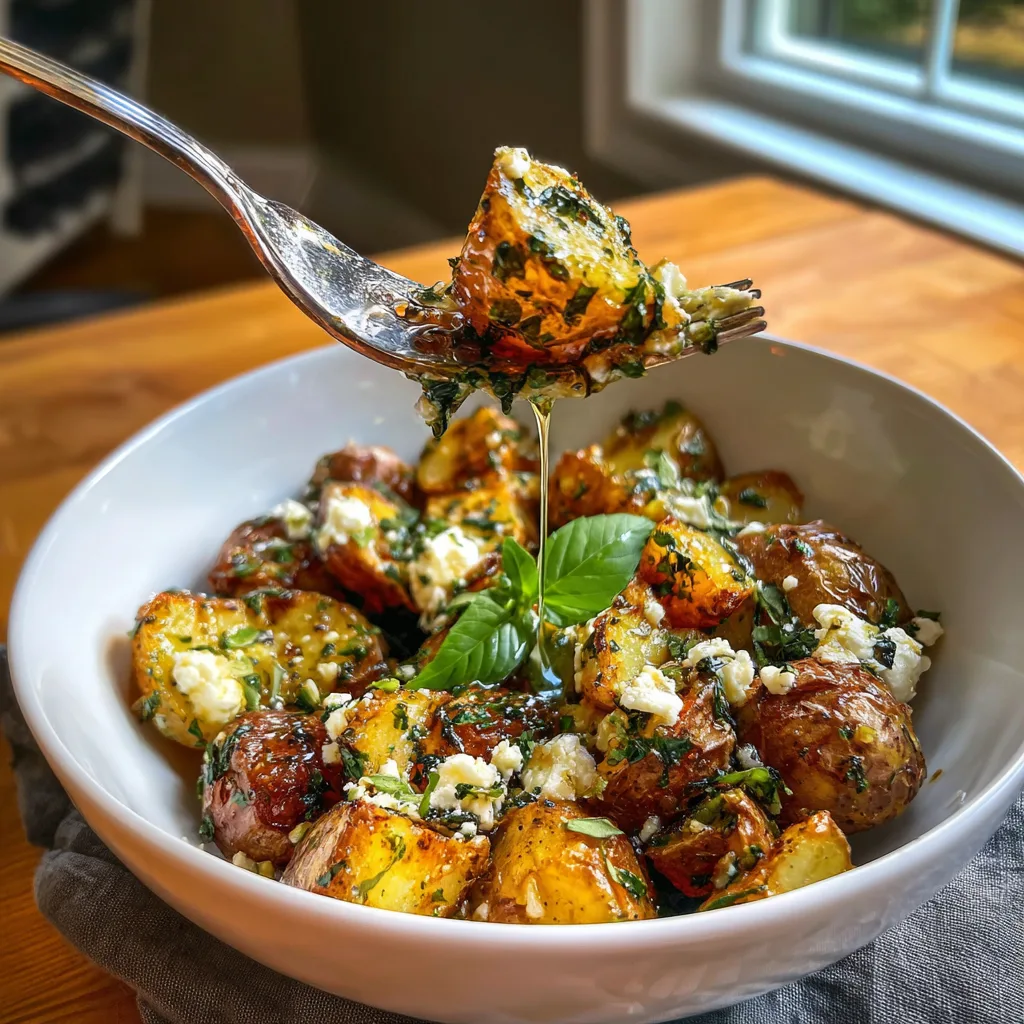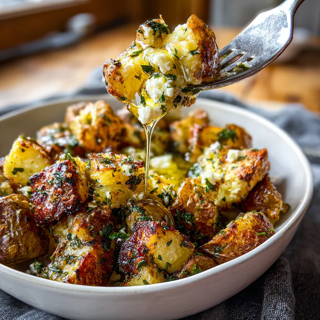 Crispy, golden-brown roasted potatoes tossed with fresh lemon, oregano, and creamy crumbled feta cheese.