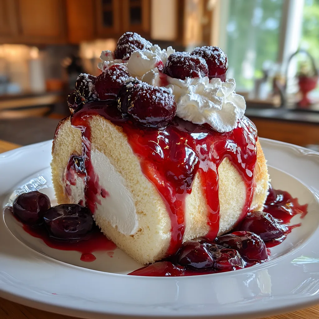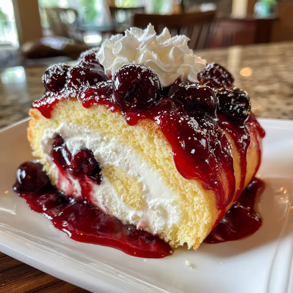 A stunning dessert featuring a fluffy vanilla sponge cake rolled around a rich cheesecake filling, topped with glossy cherry sauce and whipped cream. It’s the perfect mashup of two classic desserts.