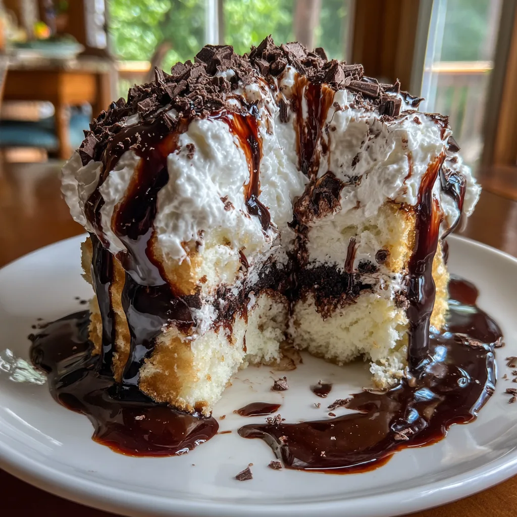 Spread the whipped cream generously over the chilled cake. Just before serving, drizzle heavily with chocolate syrup and sprinkle with shaved chocolate or cocoa powder. Slice into squares and serve cold.