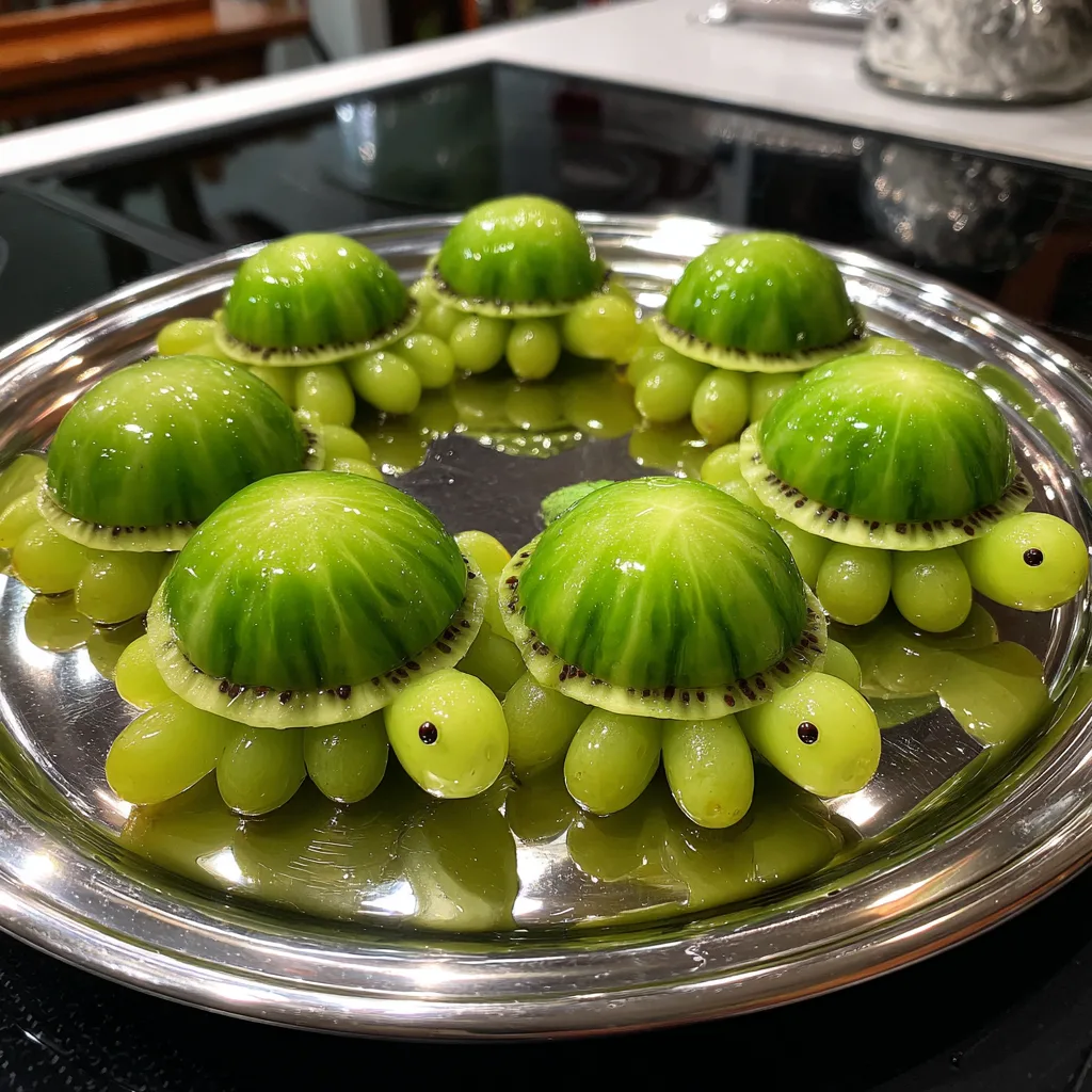 An adorable, healthy, and fun kids’ snack made by transforming kiwi slices and green grapes into cute edible turtles with tiny chocolate chip eyes.