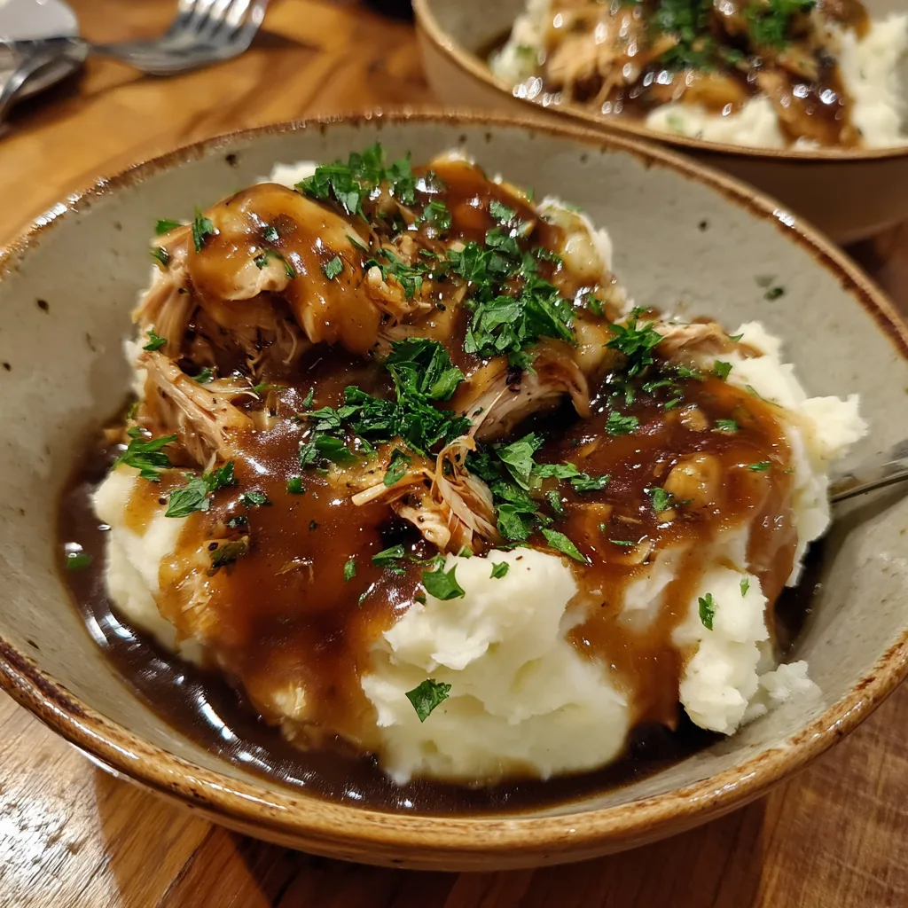 - Assemble the bowls by layering mashed potatoes, a generous scoop of shredded chicken, and a heavy pour of the hot gravy. Garnish with fresh parsley and serve immediately.