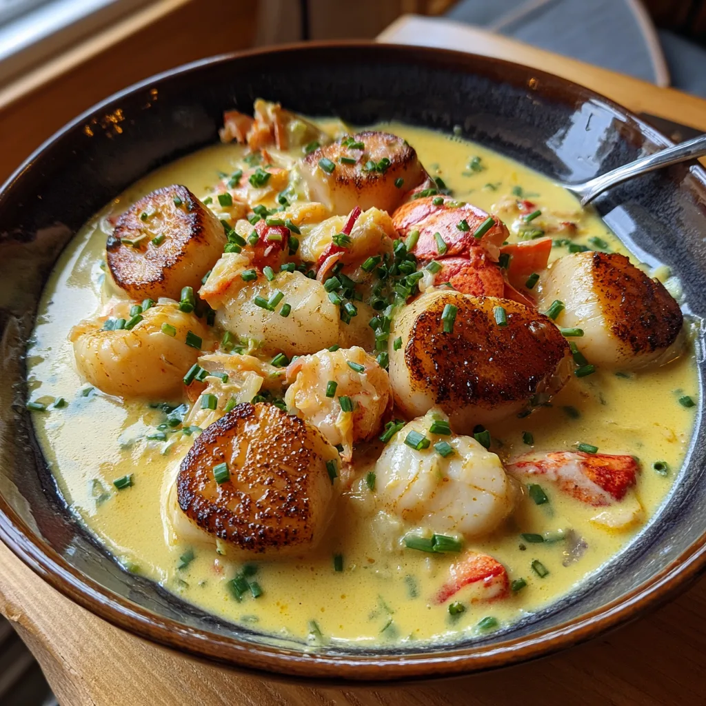 A luxurious, creamy seafood chowder packed with tender lobster chunks and topped with perfectly pan-seared sea scallops.