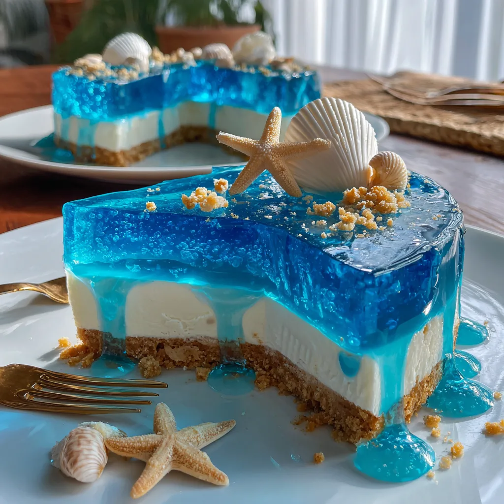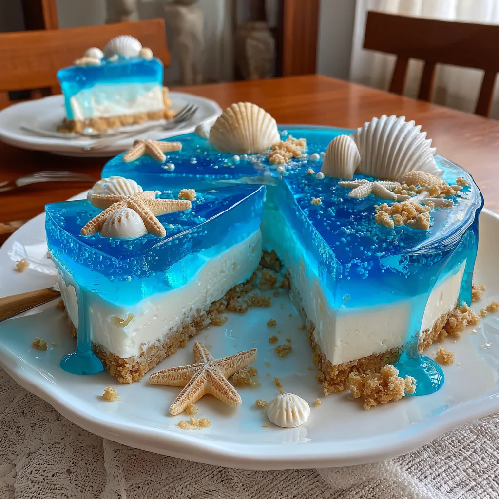 A stunning summer dessert featuring a graham cracker crust, creamy no-bake vanilla cheesecake, and a bright blue gelatin ocean layer, decorated with white chocolate seashells.