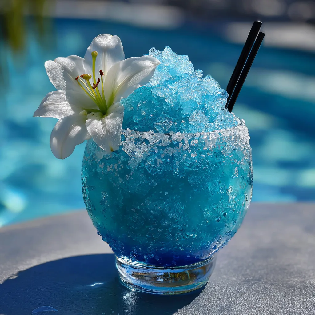 5. Pour and Garnish: Carefully pour or spoon the frozen blue mixture into your prepared, salt-rimmed margarita glass, piling it high in the center to create a majestic peak. Garnish with a fresh white flower or a lime wheel, insert a straw, and serve immediately by the pool.