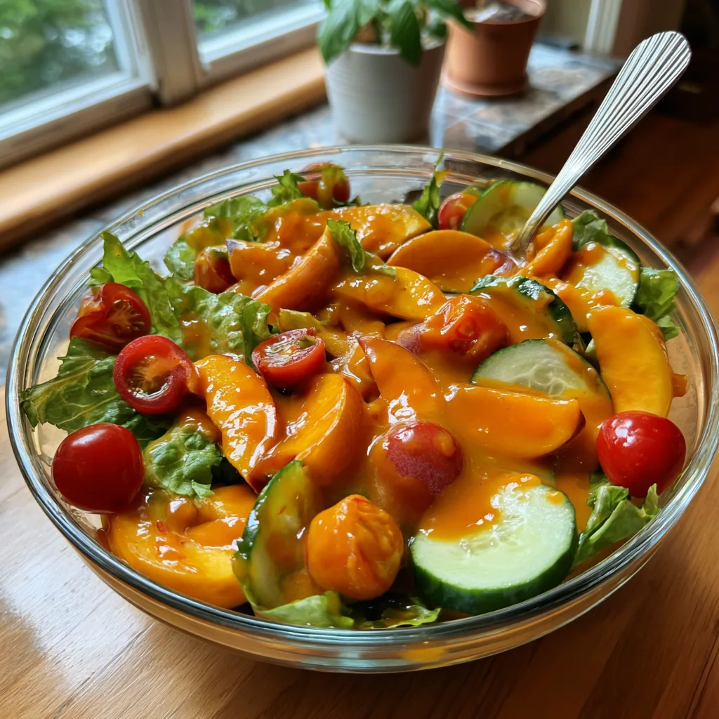 Beyond the taste, the texture of this vinaigrette is an absolute dream. Because we are blending whole fruit into the base, the dressing naturally thickens, creating a luxurious, almost creamy consistency without the need for any dairy or heavy mayonnaise. It coats every single leaf of lettuce, every slice of cucumber, and every juicy tomato half like liquid glass, ensuring that every forkful is perfectly flavored. When you toss it with the crisp, refreshing vegetables and additional fresh peach slices, you create a salad that is as texturally satisfying as it is flavorful.