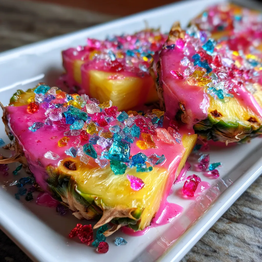 Welcome to one of the most vibrant, playful, and surprisingly delicious treats you can whip up for your next summer gathering or kids’ party: Candy-Coated Pink Glazed Pineapple Wedges. If you are looking for a dessert that bridges the gap between fresh, juicy fruit and pure, indulgent candy-shop nostalgia, this recipe is an absolute must-try. It takes the bright, tropical acidity of fresh pineapple and pairs it with a rich, sweet pink glaze and the satisfying, colorful crunch of crushed hard candies. It is an edible kaleidoscope that will have everyone reaching for seconds.