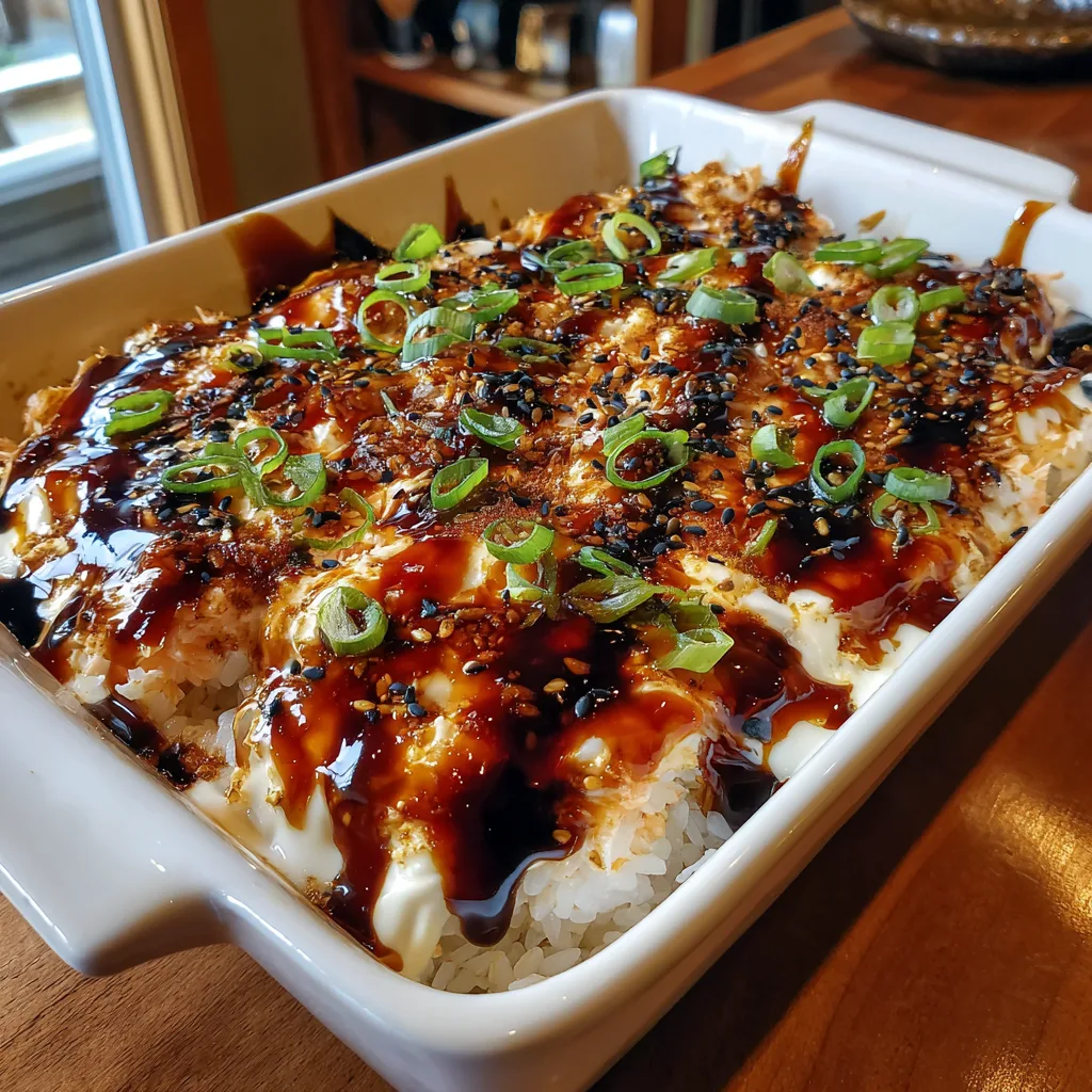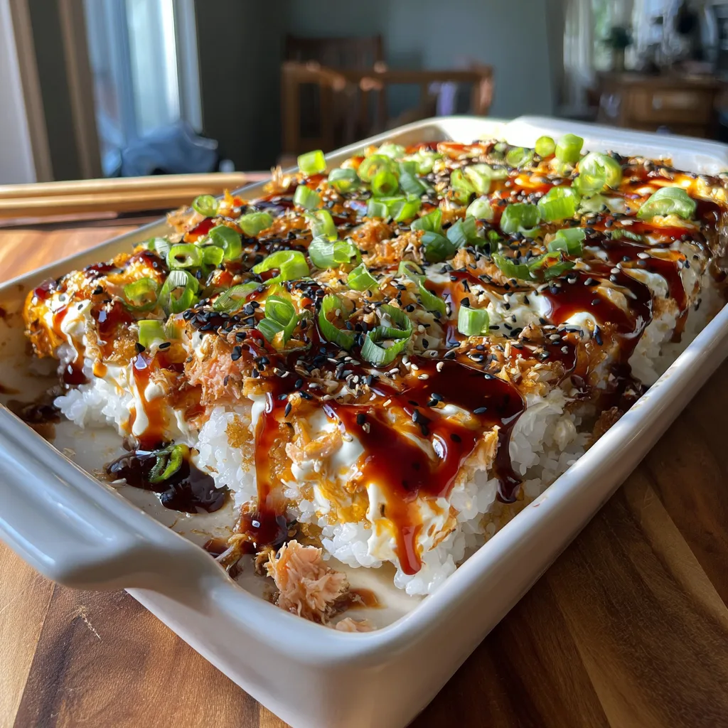 A creamy, savory, and spicy deconstructed sushi casserole featuring layers of seasoned rice, salmon, and crab, baked to perfection and served with crisp seaweed.
