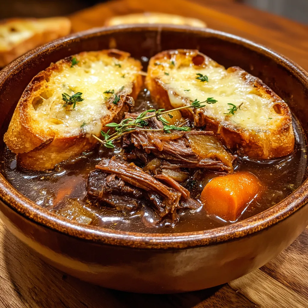 When the weather turns chilly and the days grow shorter, there is nothing quite as comforting as a warm, steaming bowl of soup. But we are not talking about just any ordinary soup today. We are talking about a luxurious, deeply savory, and incredibly hearty masterpiece: French Onion Beef Short Rib Soup. This dish marries the elegant, sweet, and savory profile of classic Parisian French onion soup with the rich, melt-in-your-mouth decadence of slow-braised beef short ribs. The result is a bowl of pure magic—a dark, glossy broth loaded with tender beef, sweet caramelized onions, hearty carrots, and topped with the iconic toasted baguette and a thick layer of gooey, melted Gruyère cheese.