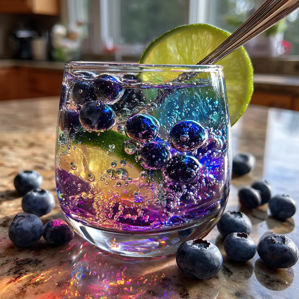 A visually stunning summer cocktail featuring a vortex of swirling iridescent colors, huge fresh blueberries, and bright lime, all bathed in a sparkling gin and club soda base.