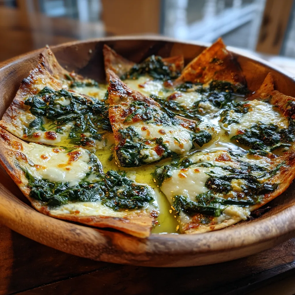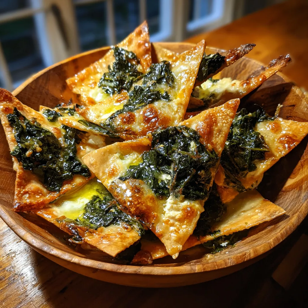 Crispy baked pita triangles topped with a savory, cheesy blend of spinach, feta, and Mediterranean spices.