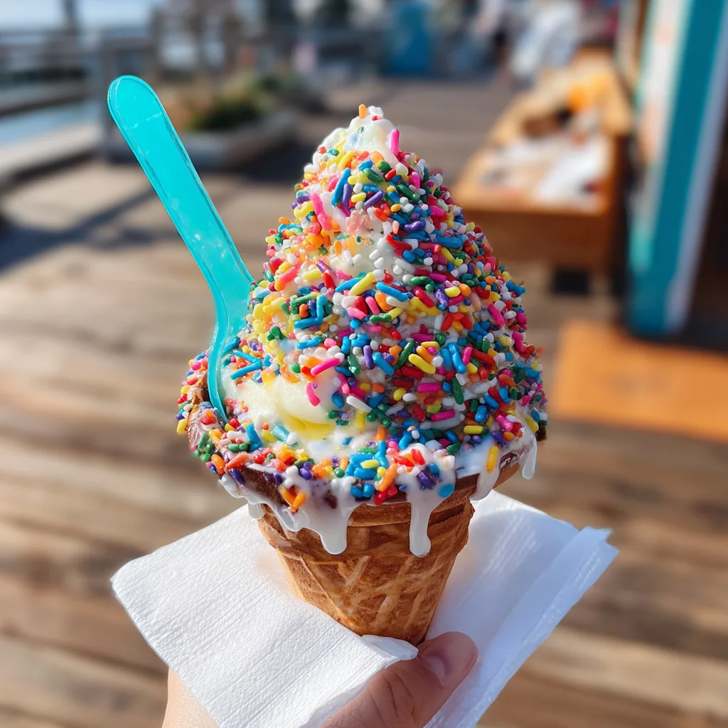 - 6. Swirl and Sprinkle (Maximum Method). Pipe or scoop the prepared soft-serve vanilla ice cream base conceptually into the sprinkle-rimmed waffle cones. To achieve maximum sprinkle coverage as seen in the provided image, you have a few options conceptually for keyword integration.