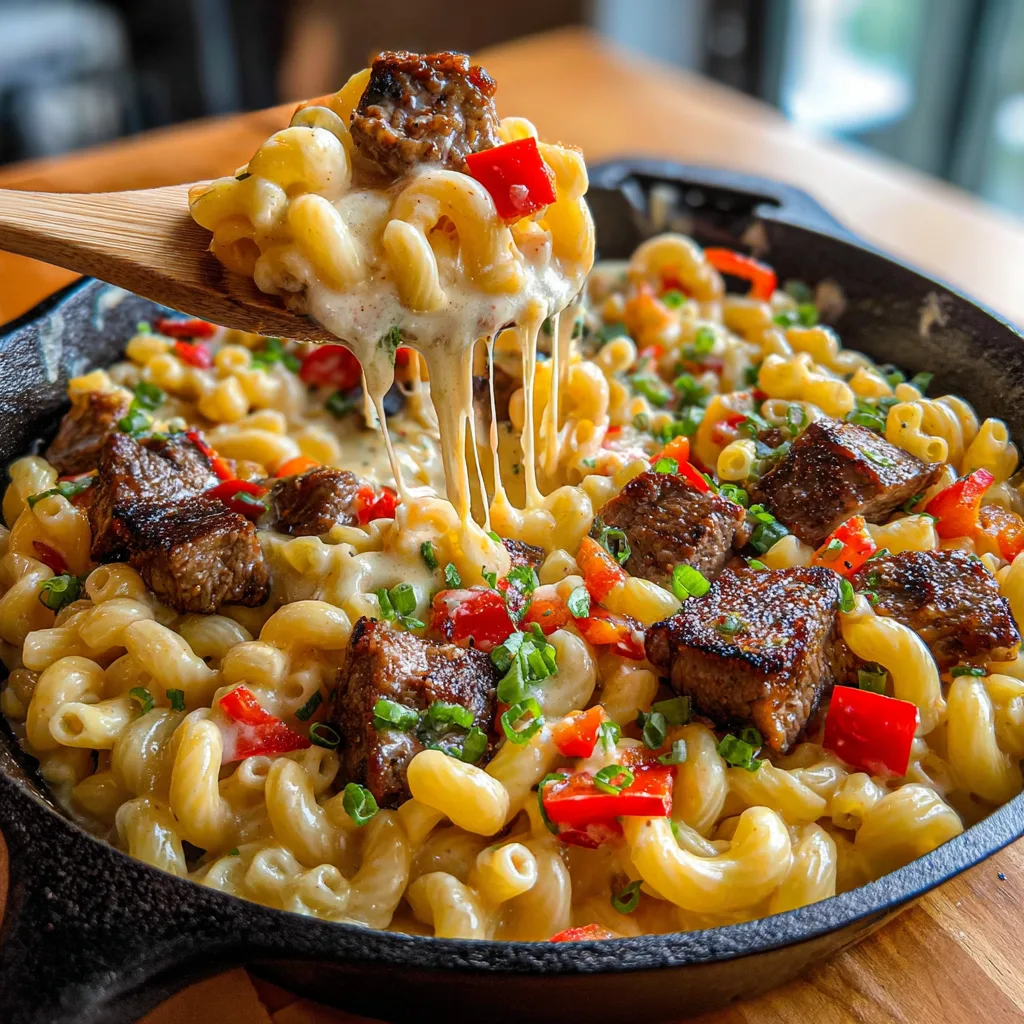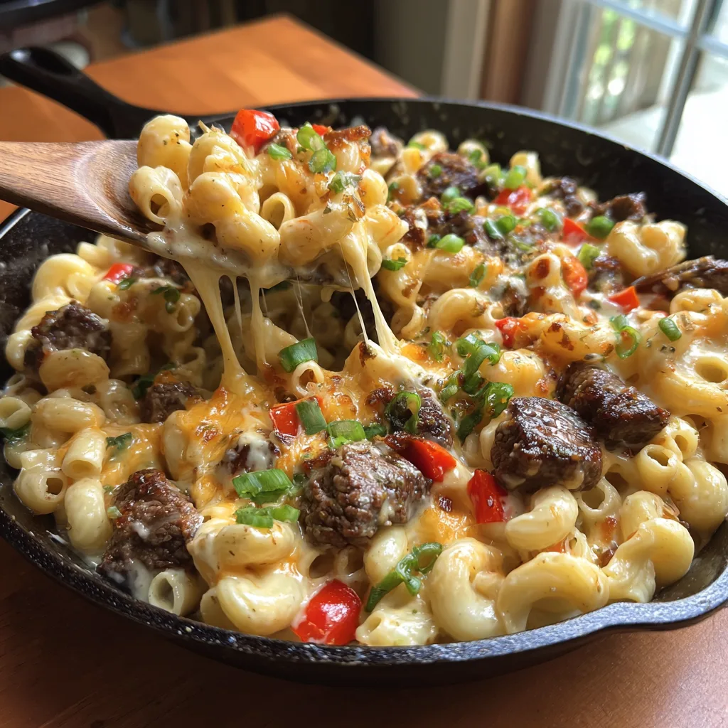 - Combine and Serve: Add the cooked macaroni, seared steak bites (along with any resting juices), and sautéed red peppers into the creamy cheese sauce. Fold everything together gently until the pasta and steak are thoroughly coated in the glossy queso.