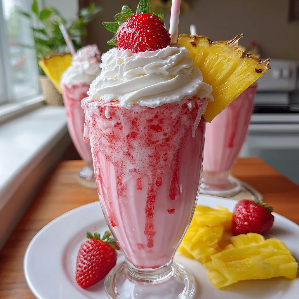 6. Pour and Garnish: Pour the frosty mixture into your chilled glass. Top generously with a swirl of whipped cream. Make a small slit in a fresh strawberry and a pineapple wedge, and slide them onto the rim of the glass. Serve immediately with a colorful straw.