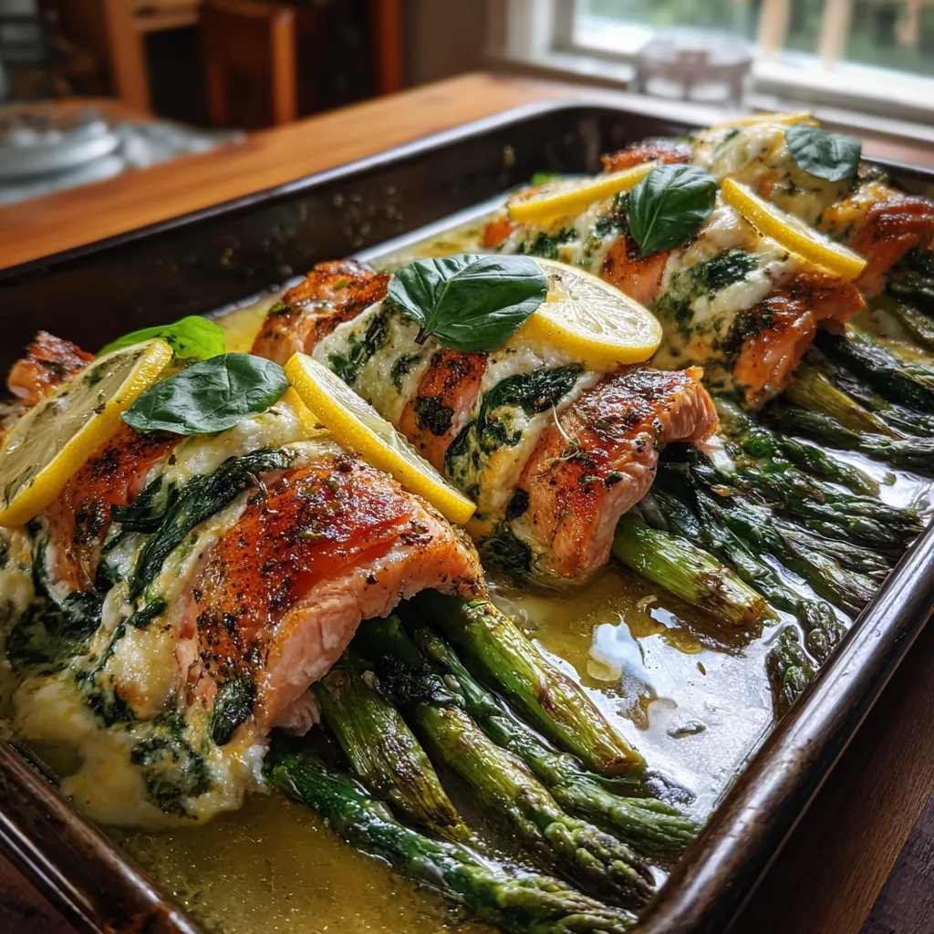 Pesto and Zucchini: If you love basil but want a shortcut, use a few spoonfuls of high-quality store-bought basil pesto spread over the salmon. Instead of asparagus, use long, thin matchsticks of zucchini and yellow squash for the center. It is a vibrant, green, and incredibly herbaceous variation.