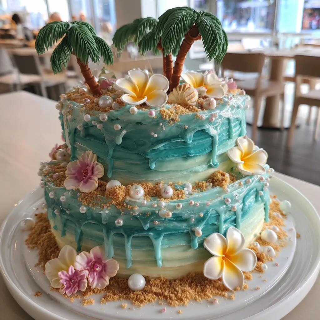 When it comes to celebrating a summer birthday, a destination wedding, or a lively backyard luau, the dessert table demands a showstopper. Enter the Tropical Beach Cake. This magnificent two-tiered masterpiece captures the serene, vibrant beauty of a tropical island getaway right in your kitchen. Featuring a stunning ombre blue wave frosting that mimics the gentle roll of the ocean, realistic fondant palm trees, delicate plumeria flowers, and a dusting of edible graham cracker sand, this cake is an edible work of art that will leave your guests absolutely speechless.