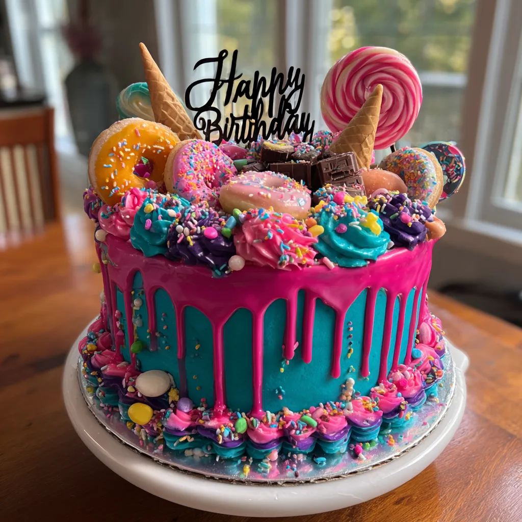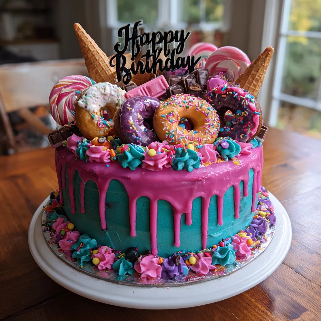 There is a profound psychological joy associated with over-the-top desserts. They transport us back to the whimsical worlds of Willy Wonka and Saturday morning cartoons. A standard cake says “Happy Birthday,” but a Candy Overload Cake screams it from the rooftops. It represents abundance, celebration, and the breaking of everyday rules. On your birthday, you shouldn’t have to choose between a donut, a chocolate bar, a lollipop, or a slice of cake—you should be able to have them all, stacked magnificently on one plate.