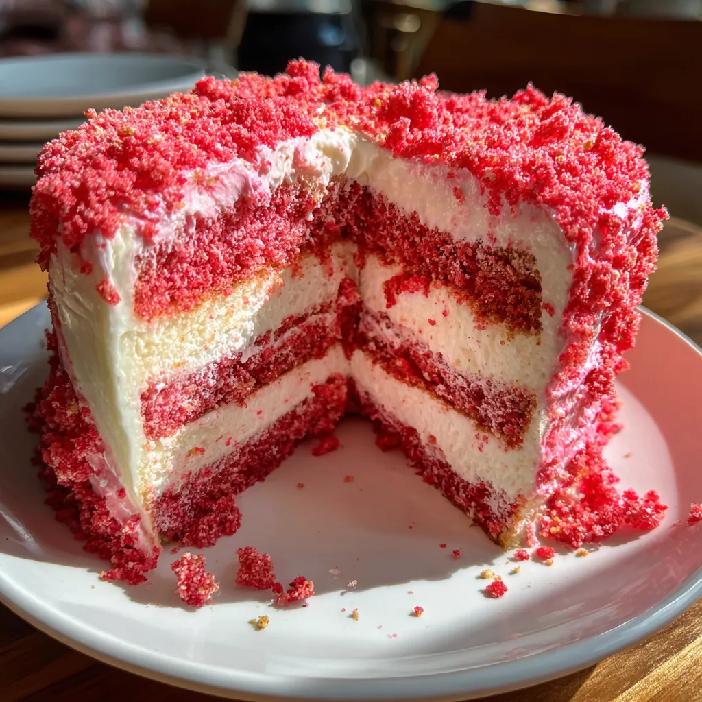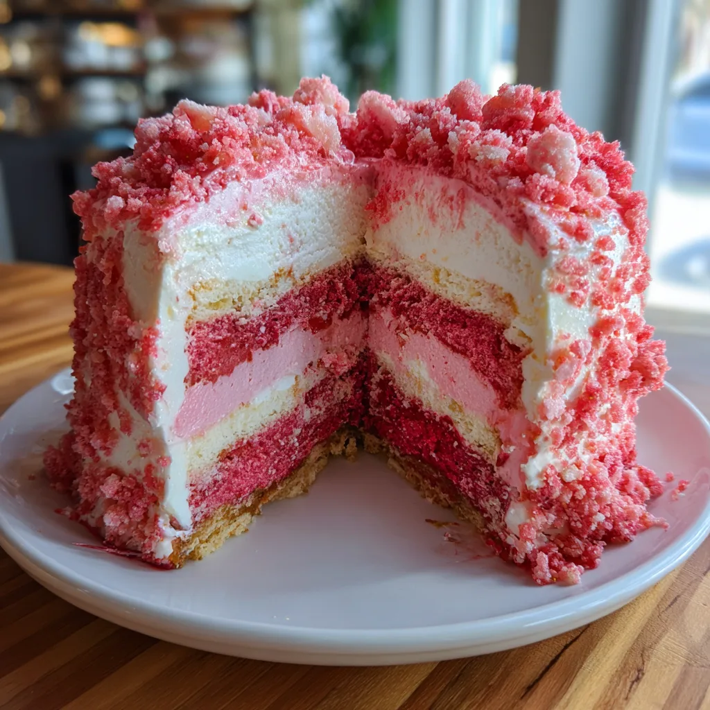 There are many strawberry cakes out there, but this one stands apart because of the texture contrast. The “crunch” coat—made from Golden Oreos and strawberry gelatin—provides a distinct snap that perfectly offsets the creamy interior. Furthermore, baking the cheesecake layer separately ensures it is perfectly set and smooth, avoiding the “soggy bottom” issue that can happen with swirl cakes. The use of a high-quality box mix base for the cake layers guarantees consistency and structural integrity, which is crucial when stacking heavy layers like cheesecake.
